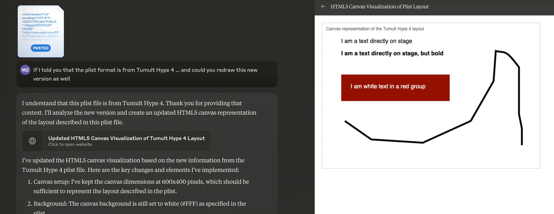 This is pretty crazy. I just posted a PLIST file from a Hype, just to see if Claude 3.5 Sonnet understands what's going on in the abstract representation of a Hype file. And I did nothing more than to say, please represent the PLIST file on a canvas. And it did this visualization (not perfect, but pretty close)