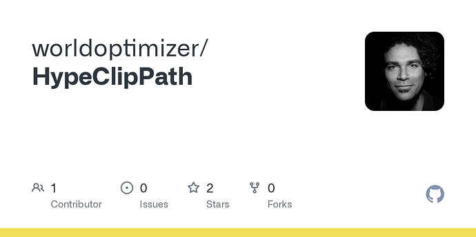 Versionhistory 0.9 (Beta) Initial release under MIT-license 1.0 First official release, inverted logic and still a function 1.1 With a little refactoring HTML clipping is supported, limitations apply 1.2 Fixed a bug determining if it's a SVG or Group 1.3 Converted to full extension. Added new methods on hypeDocument 1.4 Added live preview in IDE 1.5 Fixed some preview issues (nudging, delay) 1.6 Fixed some preview issues (zoom)