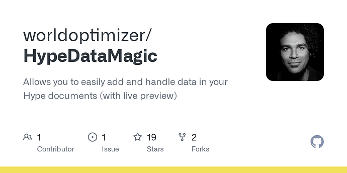 This is Hype Data Magic (actually was planned as Hype Data Fill 2) but since I started working on it again duo to client tasks and it just feels like Magic using it… I renamed it. It helps you connect data sources to Hype projects and adds a live preview. I moved the stable code to GitHub but if you want to see a development version (including some fancy stuff like indexes and fetchData) then visit the version that resides on Gumroad. I can't make any promises on how or if these feature will make it into the stable release but your welcome to try and use them.