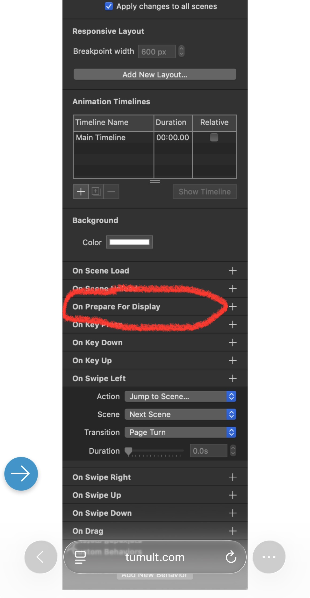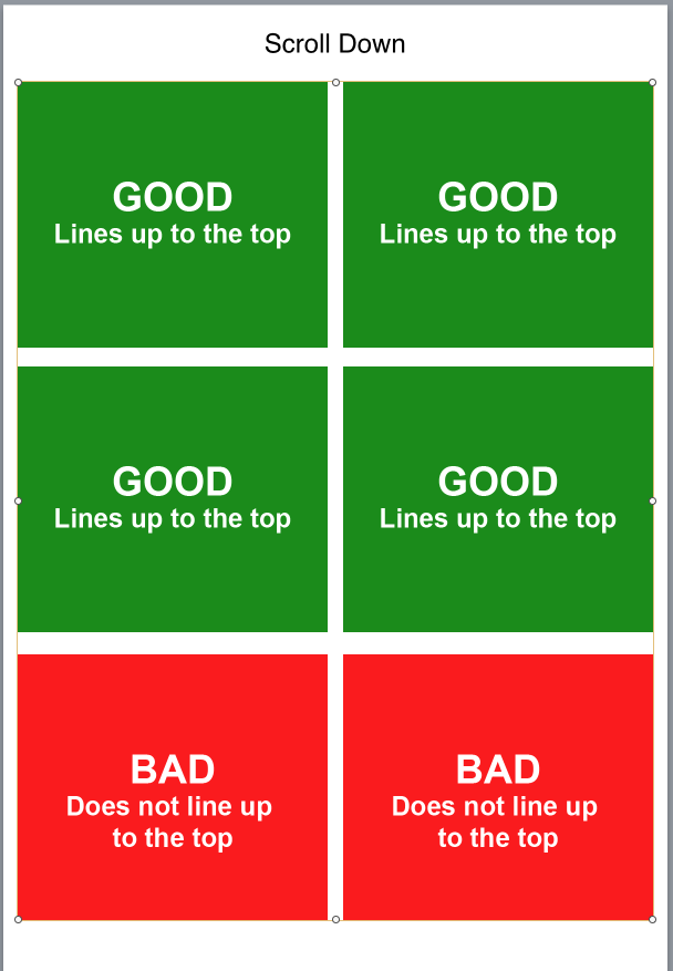If the instruction for going to the next scene is generated about 1400 pixels down from the top the new scene does not line up to the top, whether the transition is on “instant” or “push (bottom to top). I read Tumult Forum. I found some “codes” but I am not skilled in coding. What should I do to fix this? Thank you.